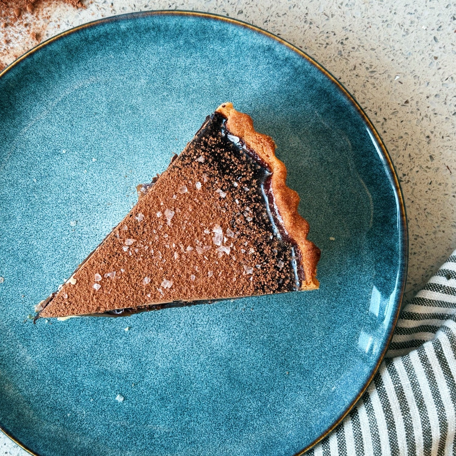 - Before serving, dust the tart with cocoa powder and add your own decorations: berries, chocolate shavings, etc. Enjoy!