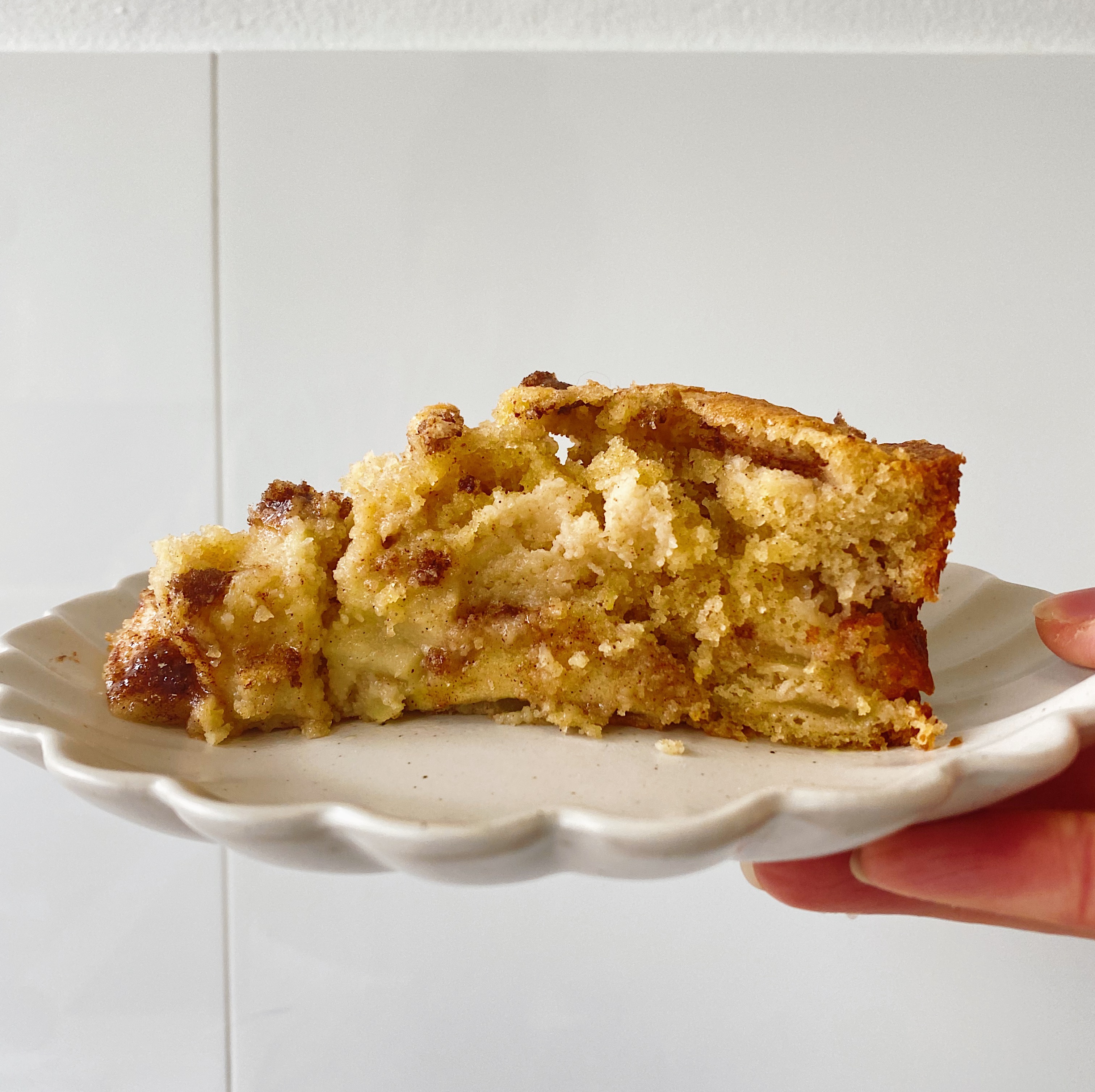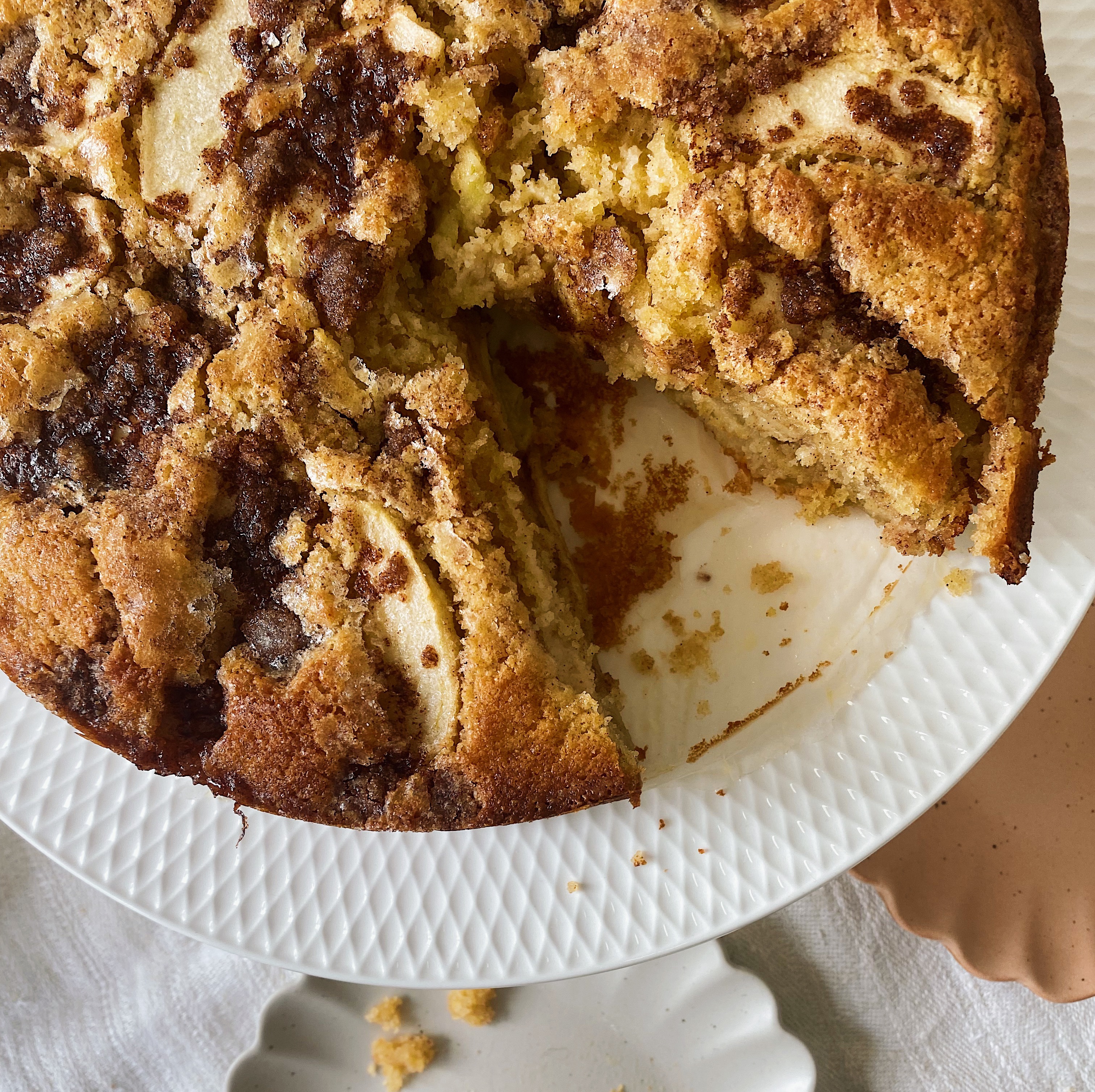 This crumb cake is comfort on a plate! Plenty of juicy apples and warming cinnamon, all in a fluffy and light cake. Enjoy this any time of the year, with friends and family, or by yourself – no rules apply!