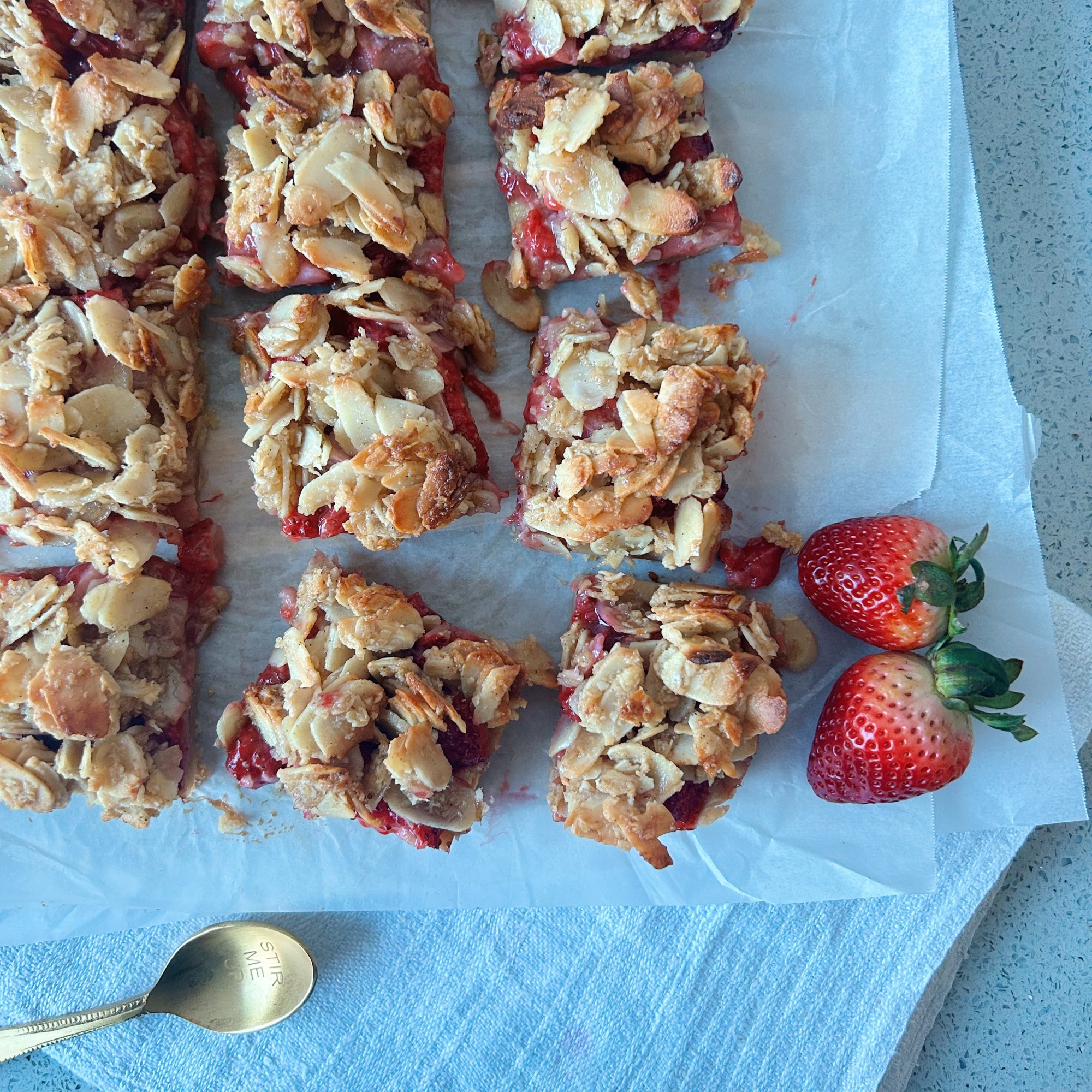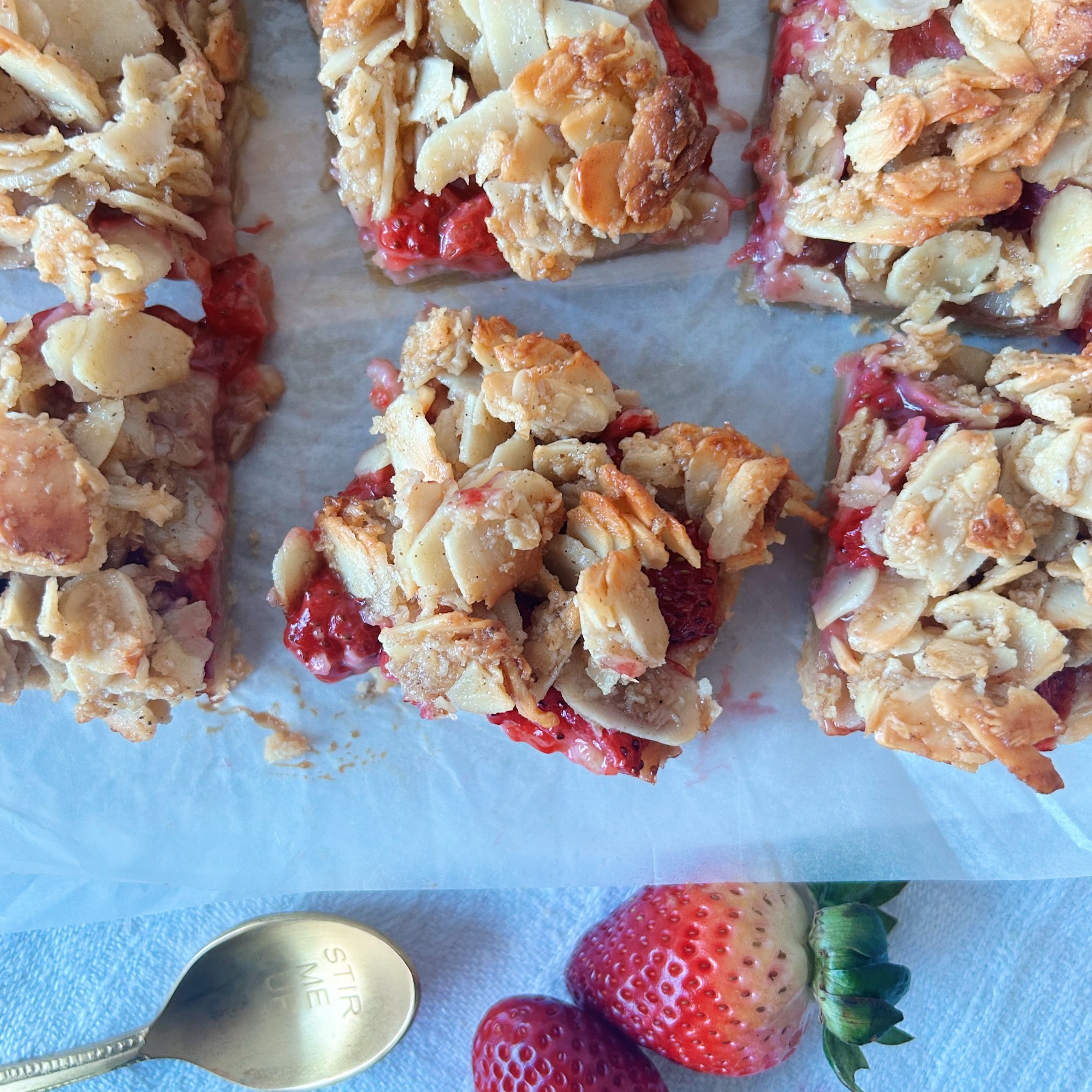 - Sprinkle the almond topping evenly over the strawberry layer. Bake for 25 minutes, or until golden and fragrant.