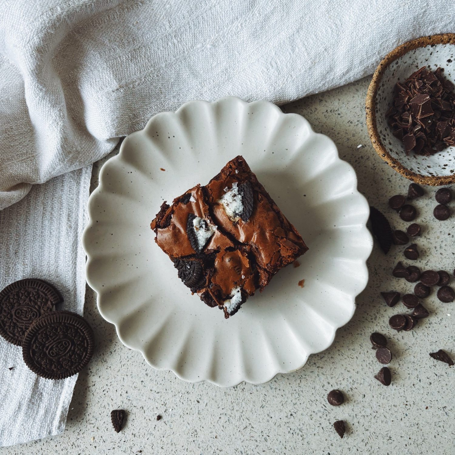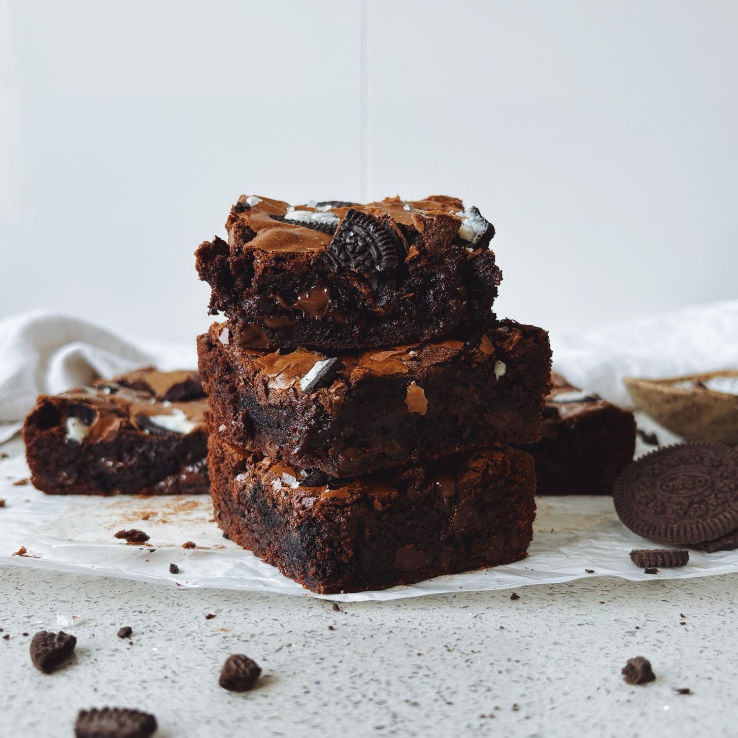 These brownies are rich, fudgy, and deeply chocolatey. Studded with chocolate chips, crushed Oreos, and a sprinkle of flaky sea salt, they strike the perfect balance: a gooey, melt-in-your-mouth centre, a glossy crackly top, and just the right hint of crunch from the cookies. Each bite offers layers of chocolatey depth and that nostalgic cookies-and-cream flavour we all love. Whether you’re baking for a crowd, indulging in a weekend treat, or simply craving something special, these brownies bring pure comfort and joy in every square.